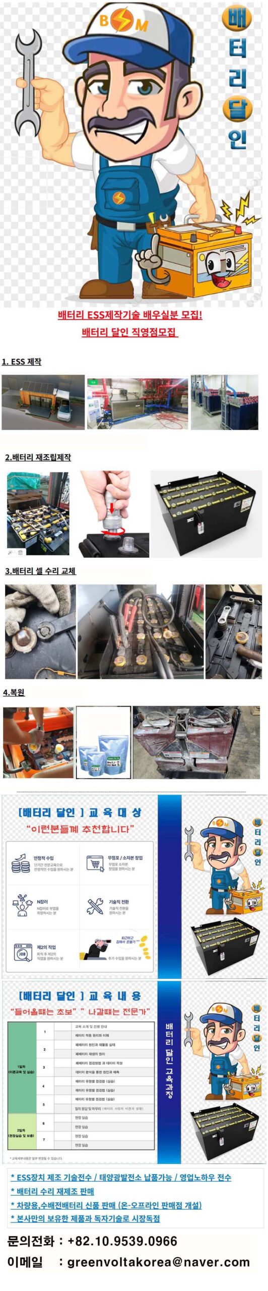 작성자* 비밀번호* 제목* 비밀글 저희 그린볼타는 스타트업 기업입니다 저희 회사는 본사를 함꼐하실 협력 대리점 사업자를 모집하고 있습니다 사전 영업진행을 통해 현지지역의 풍부한 시장성과 사업성을 파악하였기에 저희 그린볼타와 함꼐 현지 시장 개척을 통해 함꼐 회사를 성장시켜 나가실 대리점 파트너를 모집하고 있습니다 저희 회사의 주요 사업은 폐배터리 재생사업이며 주로 골프카트 배터리 ,일렉트릭포크리프트,파렛잭,스카이잭 그리고 자동차 AGM배터리를 재생을하고 있습니다 이외 가정용 ESS 소형저장 장치 제조를 통해 상시 전원공급장치를 제조공급여 전기요금을 획기적으로 절감시켜 드리고 있습니다 본사가 독자 개발한 폐배터리 또는 성능저하용 배터리 복원 제품으로써 현지 업체로 부터 그 기술을 인정받아 납품을 진행하고 있습니다 전세계 유일하게 독자 개발한 텔레미어 분말은 95%의 성능 복원 효율을 나타내기 떄문에 본사를 믿고 사업을 진행하셔도 절대 후회하지 않는 선택이 될것입니다 본사가 가진 기술과 노하우 전수를 통해 현지 시장을 함꼐 개척해나가실 진취적이고 역량있는 대리점 파트너를 모집하고 있으니 많은 지원 부탁드립니다 * 부족한 내용은 이메일로 문의를 주시기를 자세한 제품의 설명과 사업 내용을 보내드리도록 하겠습니다 * 감사합니다 문의전화 : +82 - 10 - 9539 -0966 이메일 : greenvoltakorea@naver.com 홈페이지 : http://greenvolta.io 이미지 이미지 삽입 찾아보기 취소 확인